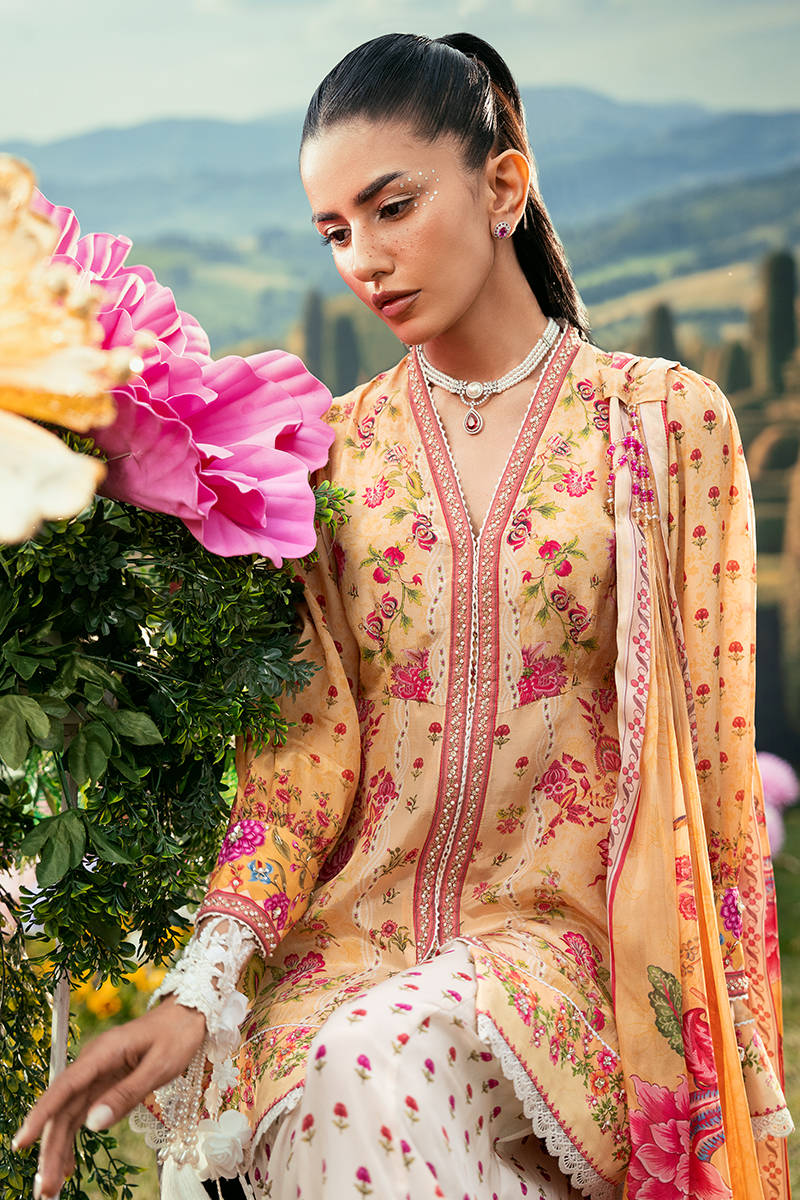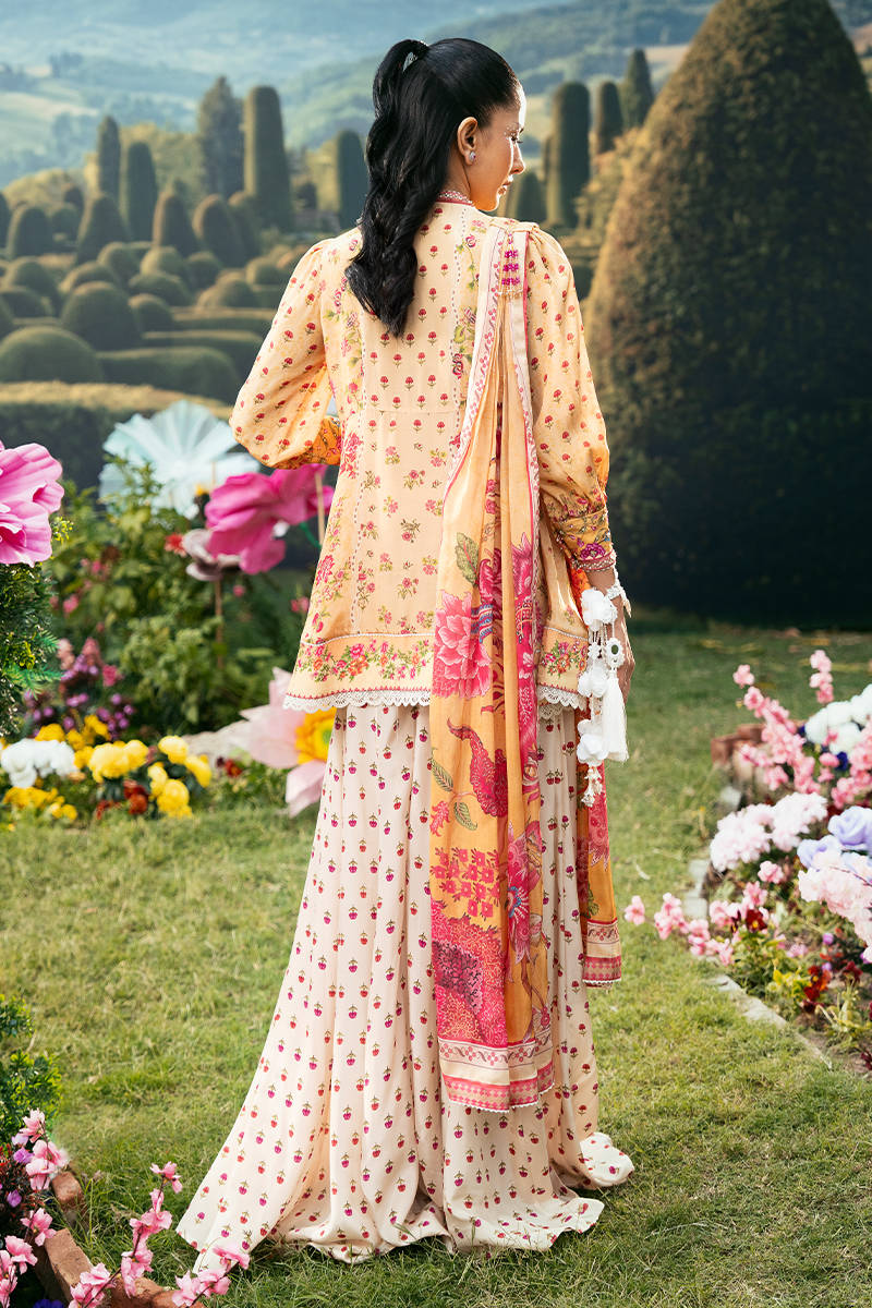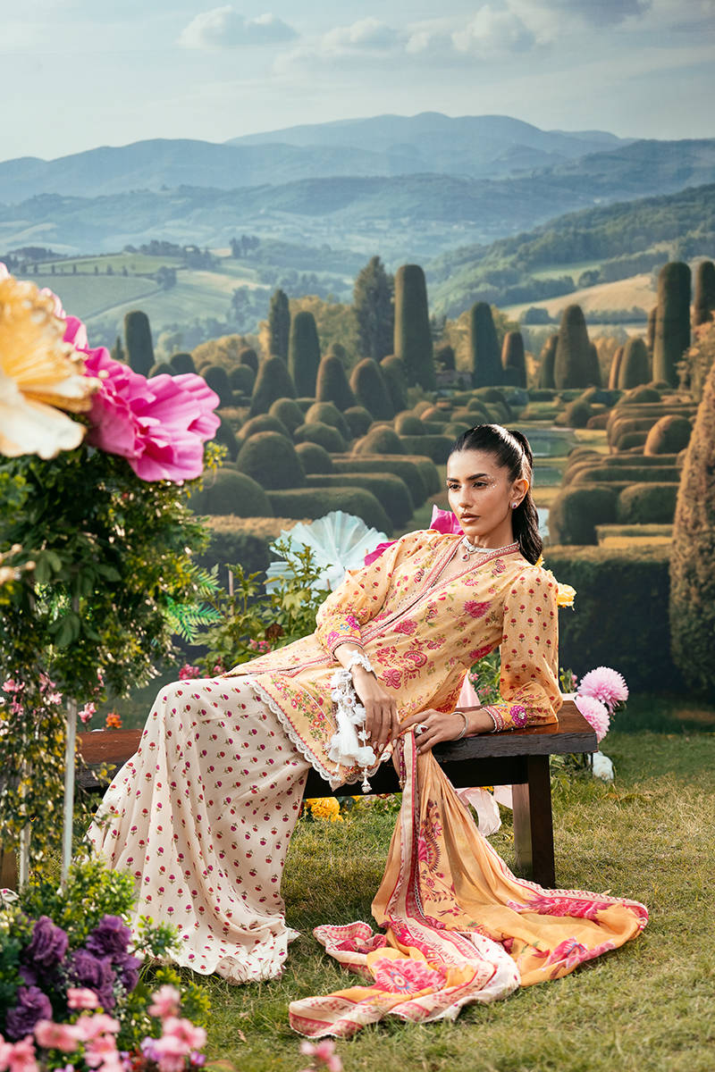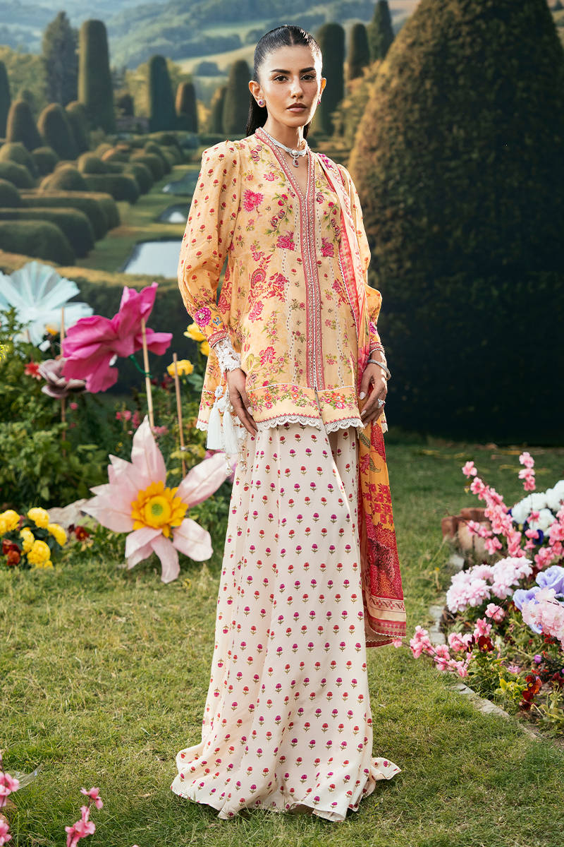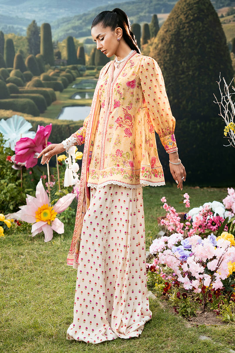 A front-open printed short shirt in a soft, romantic palette, designed with a flattering V neckline that highlights its delicate detailing. The voluminous sleeves introduce a contemporary flair, adding dimension and charm to the silhouette. It is paired with printed bambi pants that create fluid movement and a playful elegance. The look is completed with a statement drape, adorned with vibrant floral elements and finished with intricate borders, adding a striking layer of color and artistry.