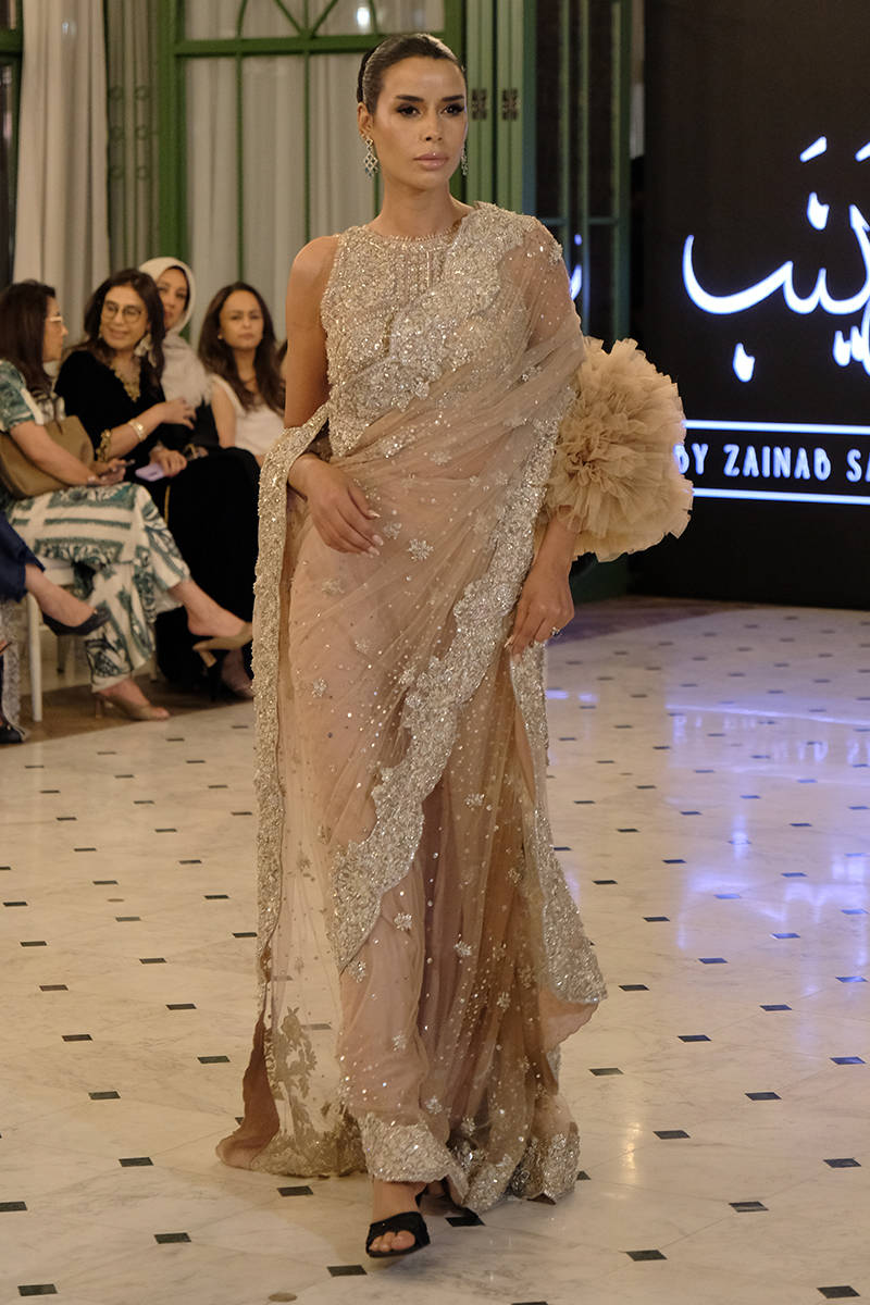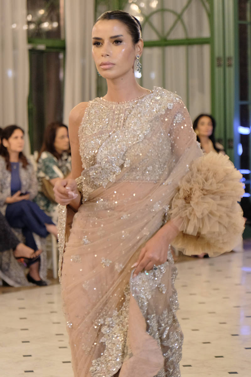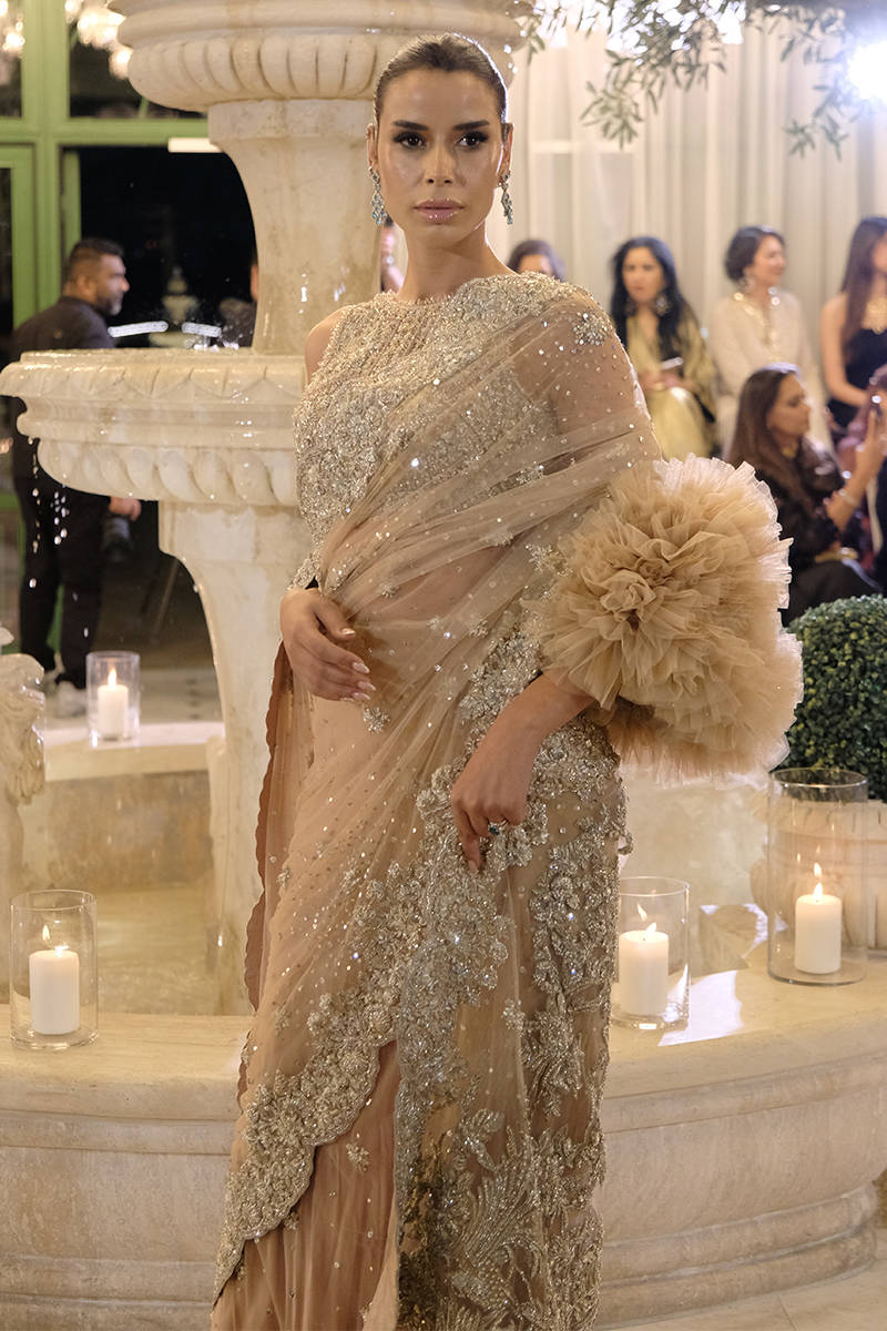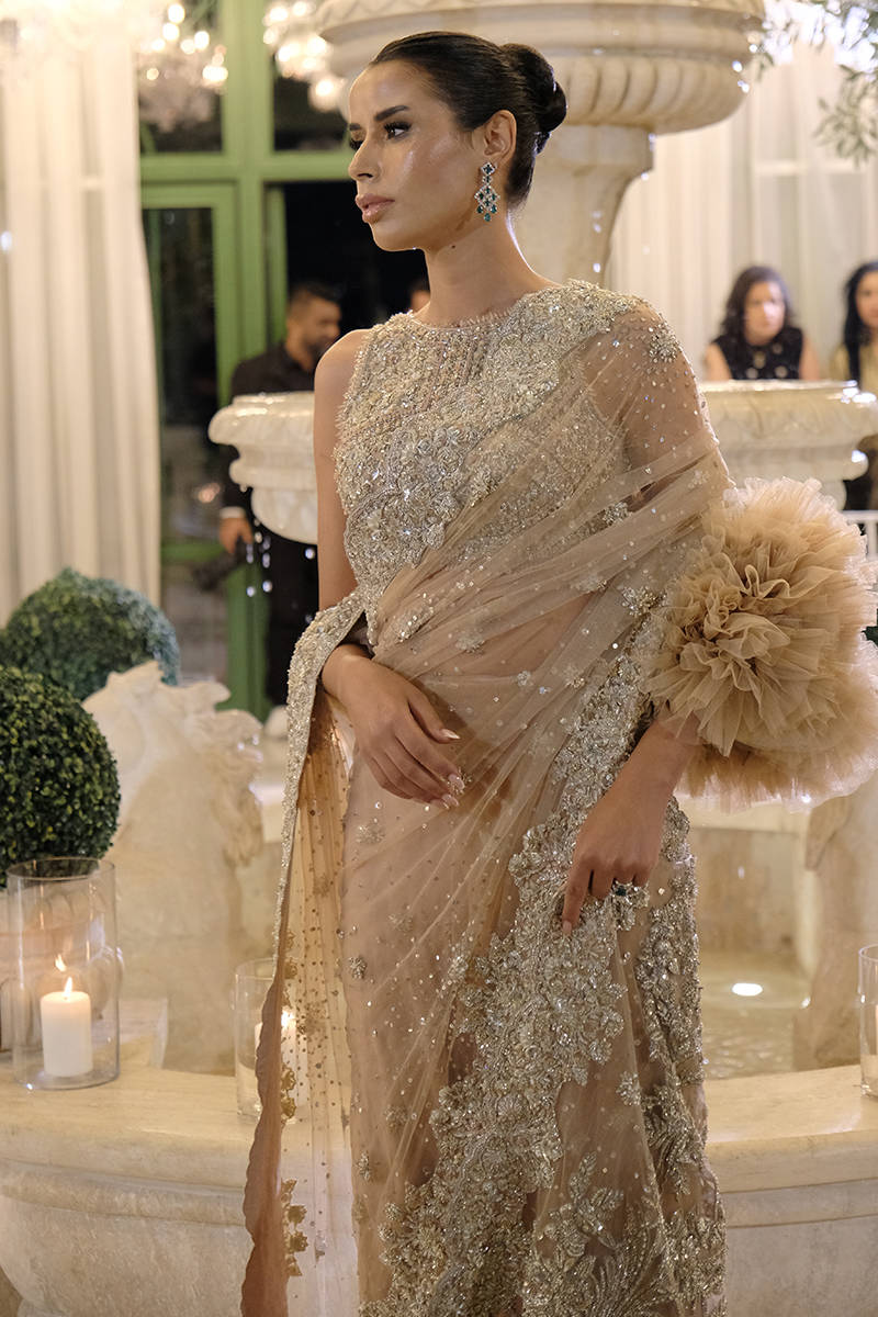 A timeless and stunning nude-colored bridal saree, heavily hand-embellished with exquisite Swarovski crystals, dabka, and zardozi, making it a truly exceptional outfit. Crafted from sheer net fabric, this saree combines substantial embellishments with a lightweight construction, ensuring a graceful drape. The drape is enhanced with a sophisticated blend of sequins, beads, and zari, adding a regal impact to the ensemble. The blouse features a halter neck design, which accentuates the elegance of the entire look while incorporating an element of modesty. For an alternative styling option, the saree can also be paired with a nude corset and ruffles for sleeve.