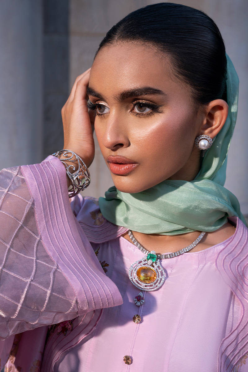 An eye-catching powder pink long jacket, crafted from pure jamawar, featuring intricate floral motifs that exude timeless elegance. The look is elevated with a beautifully detailed inner, accented with delicate buttons that lend a refined Middle Eastern aesthetic. Paired with a dual-toned, contrasting scarf, this ensemble is effortlessly graceful—making it the perfect choice for occasions.
