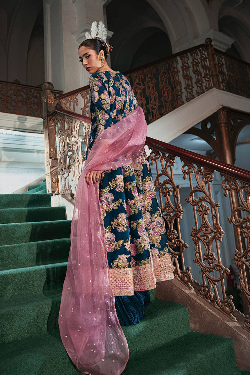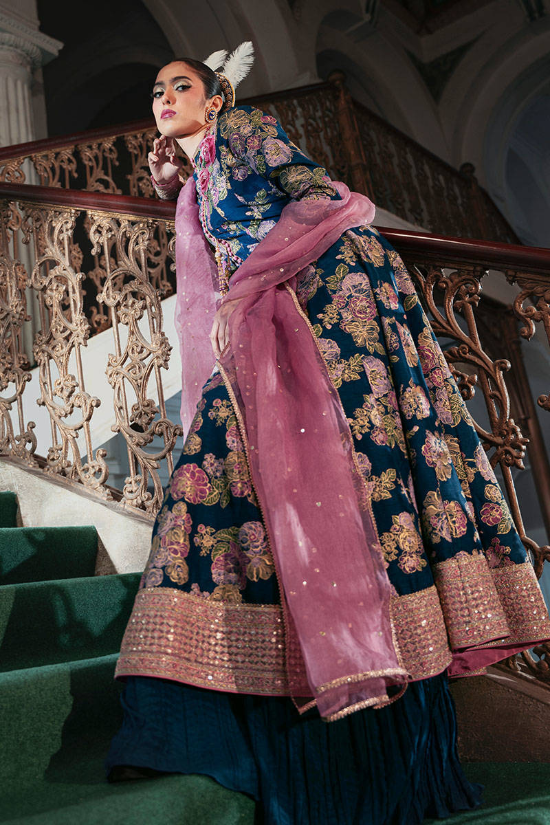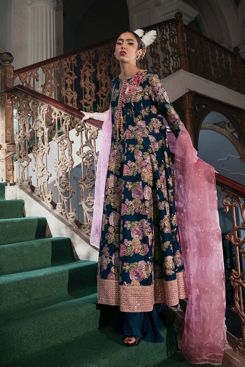 "Printed Gale" is a stunning electric blue raw silk kalidar, featuring a delicate floral print and intricately hand-embellished motifs on the bodice. The addition of contrasting pink loop buttons with tassel detailing adds a bold, eye-catching element to the design. The kalidar’s sophisticated charm is further enhanced by fitted full sleeves and beautifully embroidered borders along the cuffs and hem. To complete the look, a contrasting pink organza dupatta, adorned with a shimmering sequin spray, adds an ethereal touch. Paired with crushed trousers to introduce a modern fusion, this ensemble is sure to turn heads at any event, seamlessly blending tradition with contemporary style.