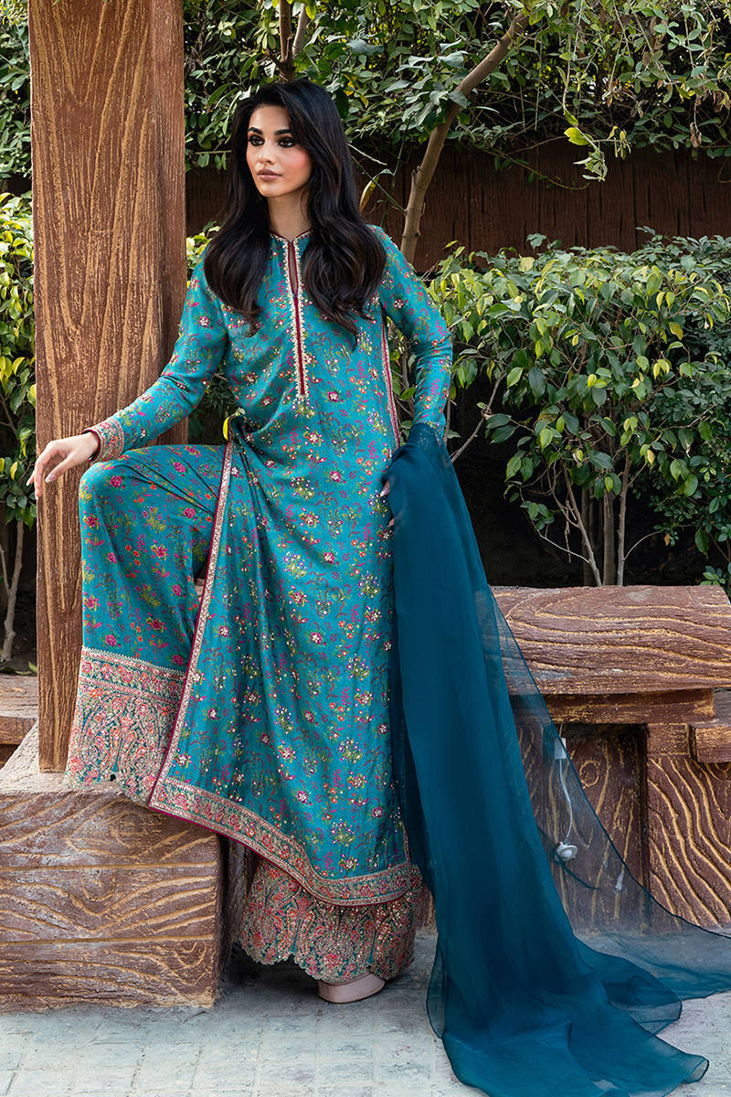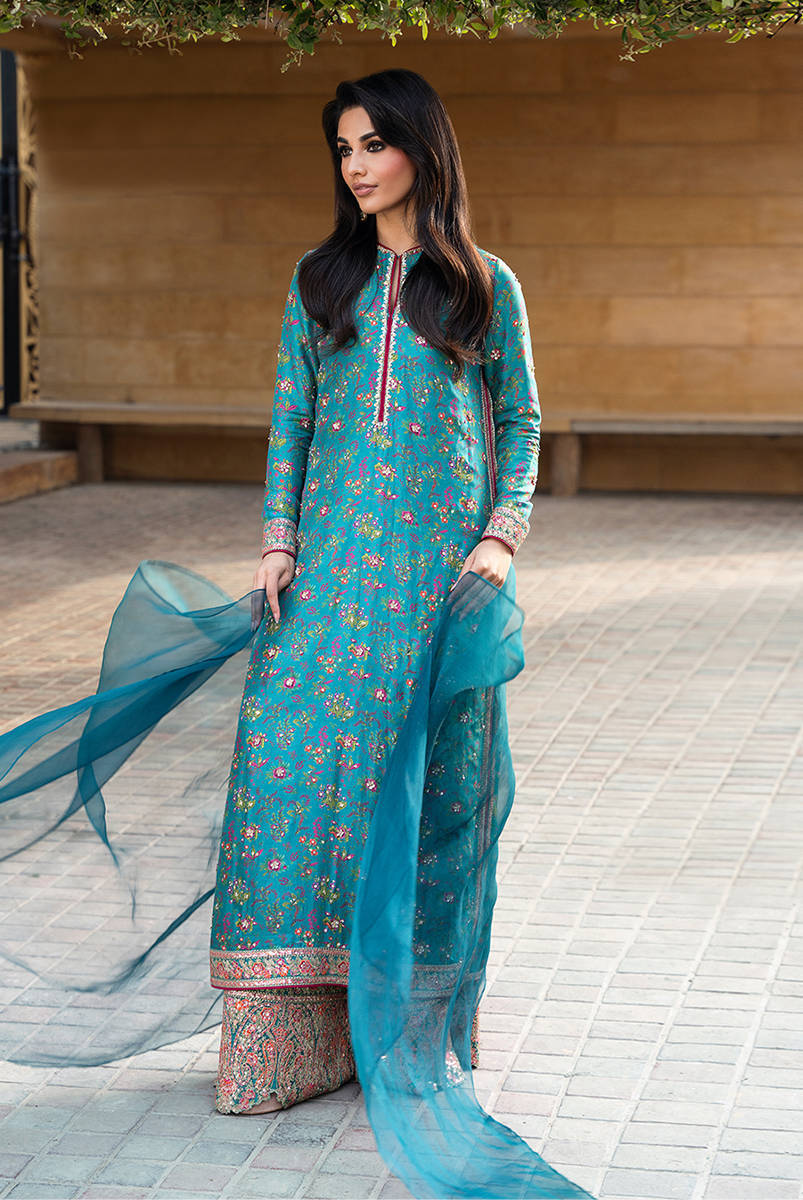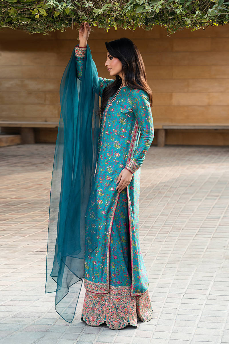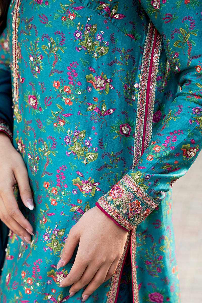 Digitally printed teal shirt crafted from pure raw silk, giving the ensemble a rich texture and luxurious finish. The shirt is enhanced with delicate hand embellishments, adding subtle sparkle and intricate detailing that elevate its overall appeal. Paired with the shirt is a matching digitally printed pant made from premium PK raw silk fabric, featuring tasteful prints that complement the shirt perfectly while maintaining a graceful silhouette.Completing the look is a lightweight organza dupatta that adds sophistication and movement.
