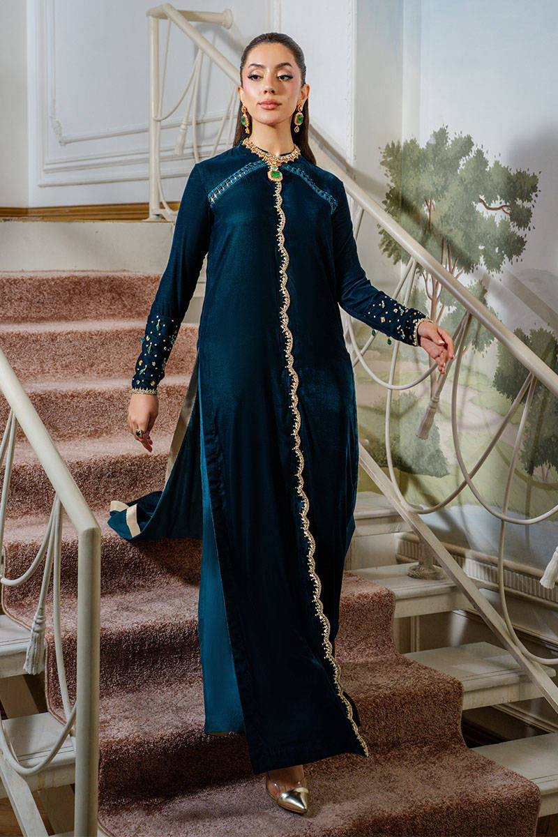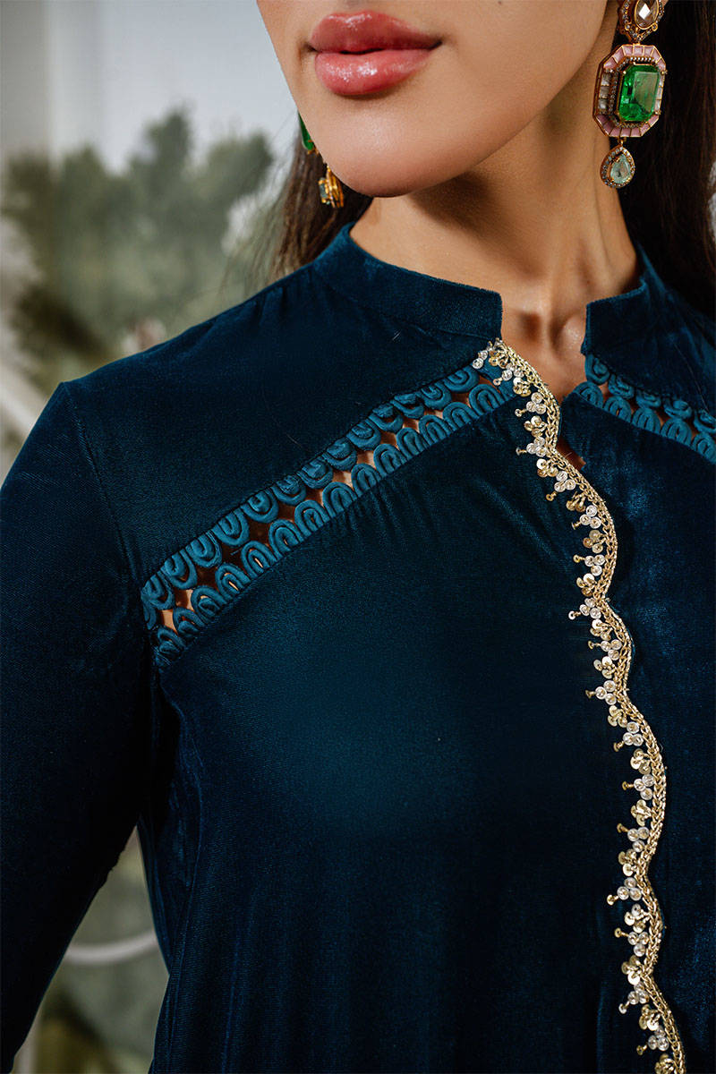 Color: Shirt: Teal Green and Pants: Teal Green Fabric: Shirt: Velvet and Pants: Satin Silk Work Details: Hand-Embellished