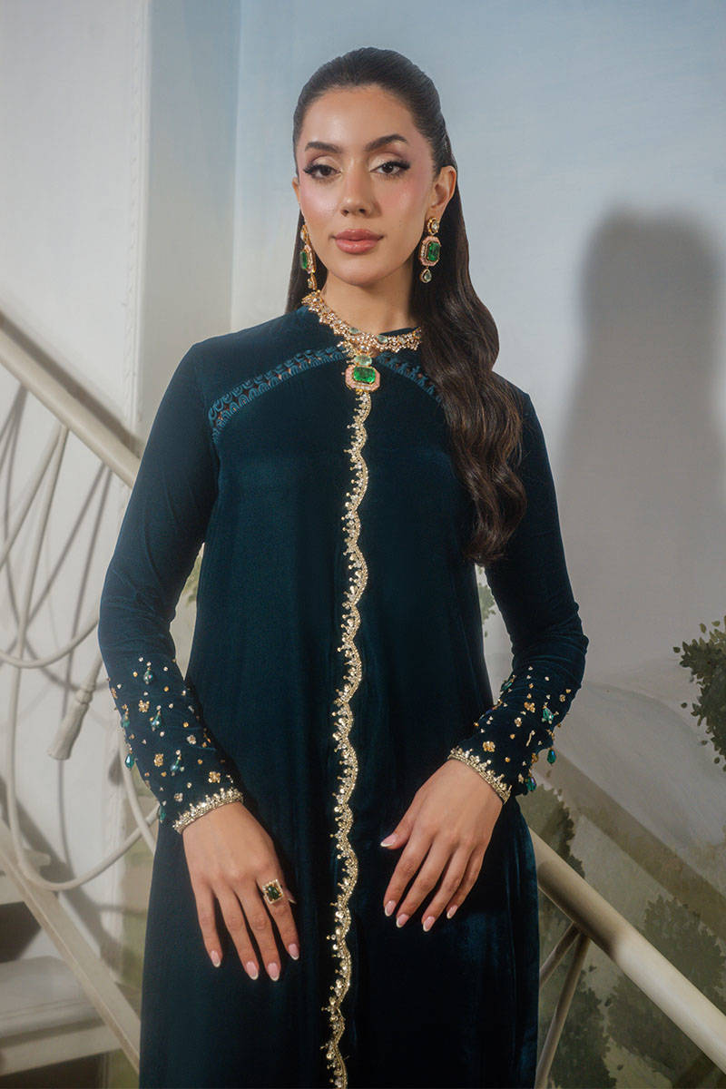 Color: Shirt: Teal Green and Pants: Teal Green Fabric: Shirt: Velvet and Pants: Satin Silk Work Details: Hand-Embellished