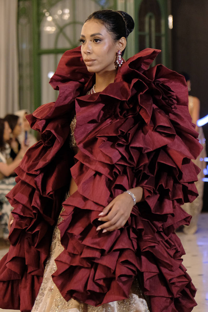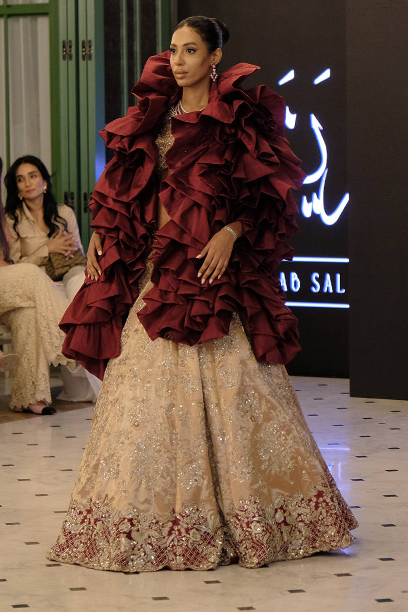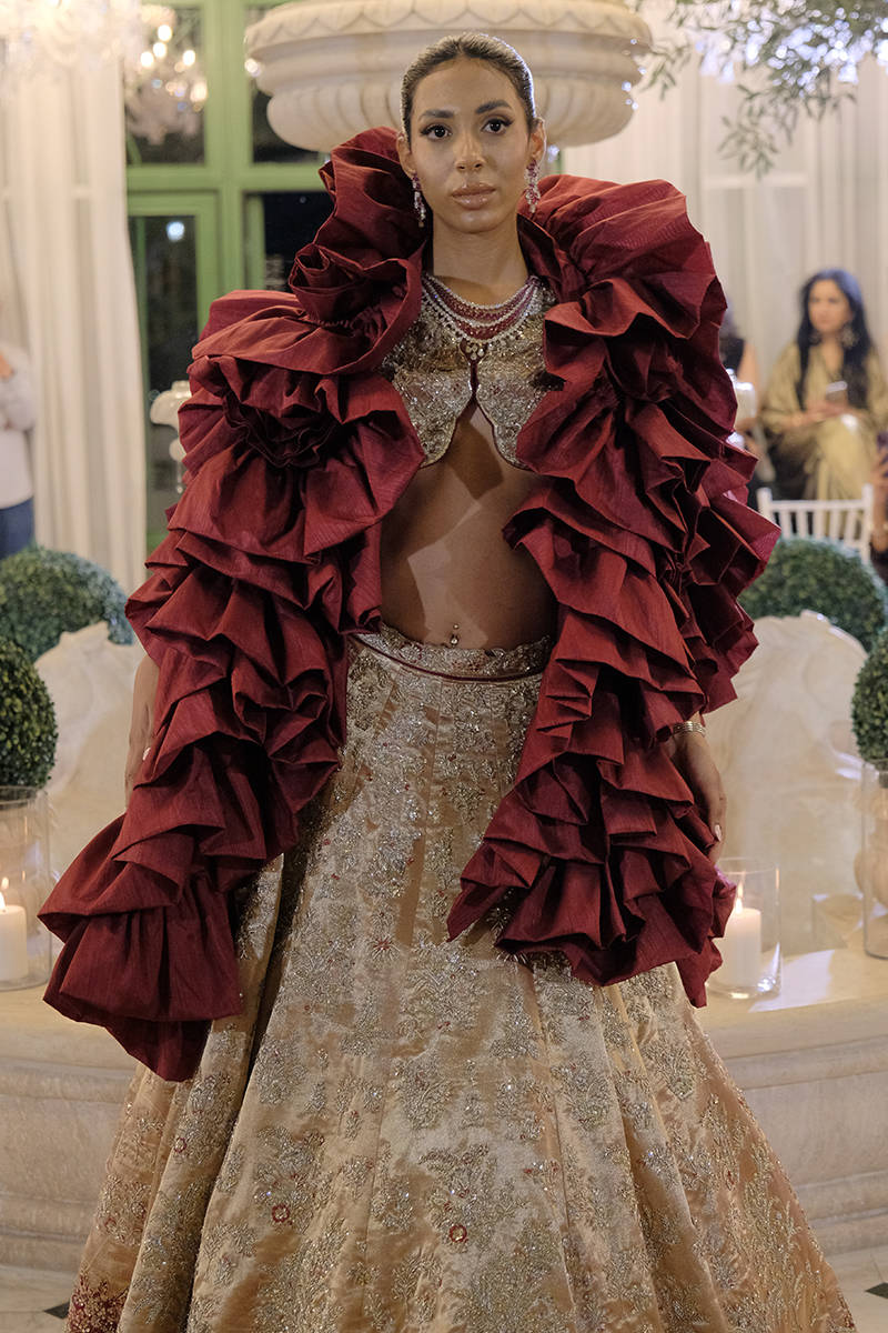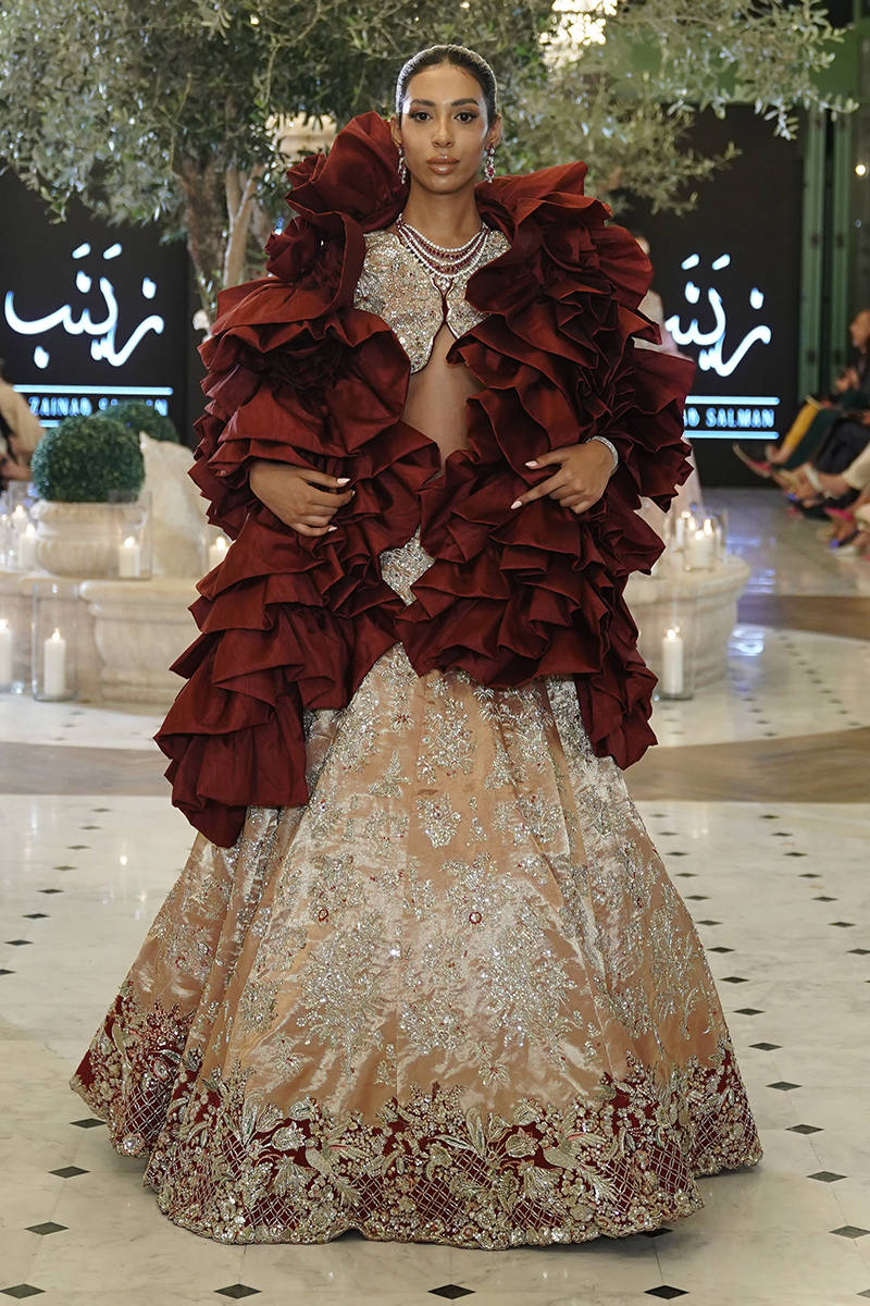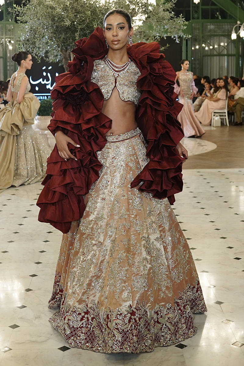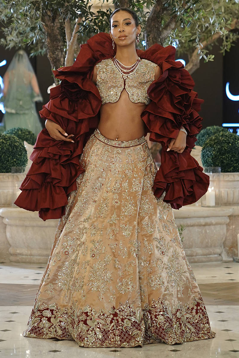 A timeless tea-pink pure tissue lehenga choli, lavishly hand-embellished with Swarovski crystals, dabka, and zardozi, creating a masterpiece of elegance and grandeur. The silhouette is enhanced with regal maroon finishing along the hem, adding a striking contrast that captures the eye. The outfit is paired with a deep maroon net dupatta, exquisitely adorned with resham embroidery, sequin spray, hand-embellished boti work, and intricately worked heavy borders. A flawless blend of tradition and modernity, this look is perfect for the bride who seeks both grace and opulence. taffeta can be added