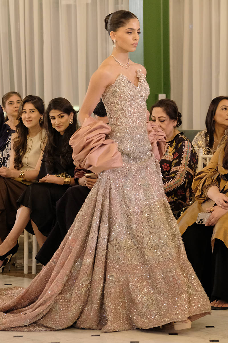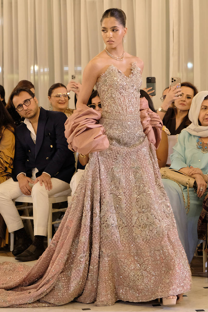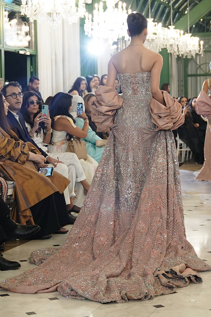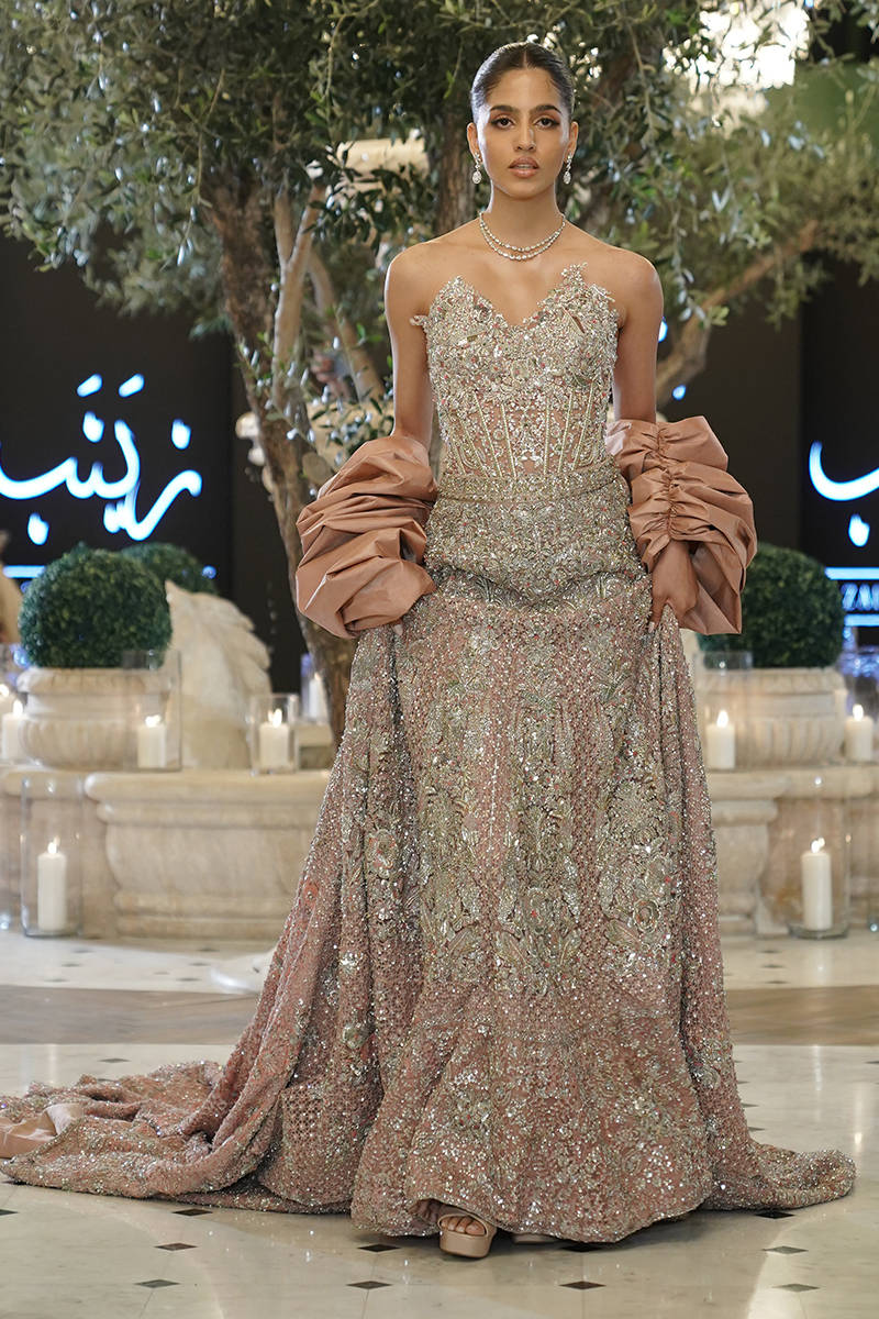 Exuding majestic allure, this exquisite pastel pink bridal gown features a heavily hand-embellished long trail. Adorned with embellishments, the gown exhibits a shimmering metallic effect. The design incorporates delicate Swarovski crystals, dabka, zari, and intricate beadwork, all contributing to the ensemble's refined elegance. The outfit is completed with fully embellished sleeves and a body-hugging trail skirt that enhances its overall beauty. The ensemble is further elevated by a stunning, heavily embellished veil, which adds an extravagant touch. This veil imparts a regal and contemporary aesthetic to the outfit, completing the bridal look with sophistication. It can also be paired with a Corset and taffeta for sleeves