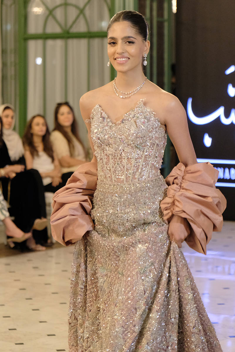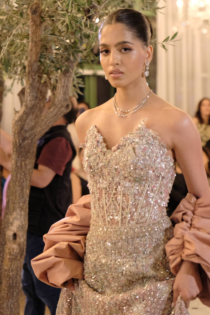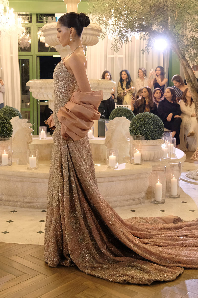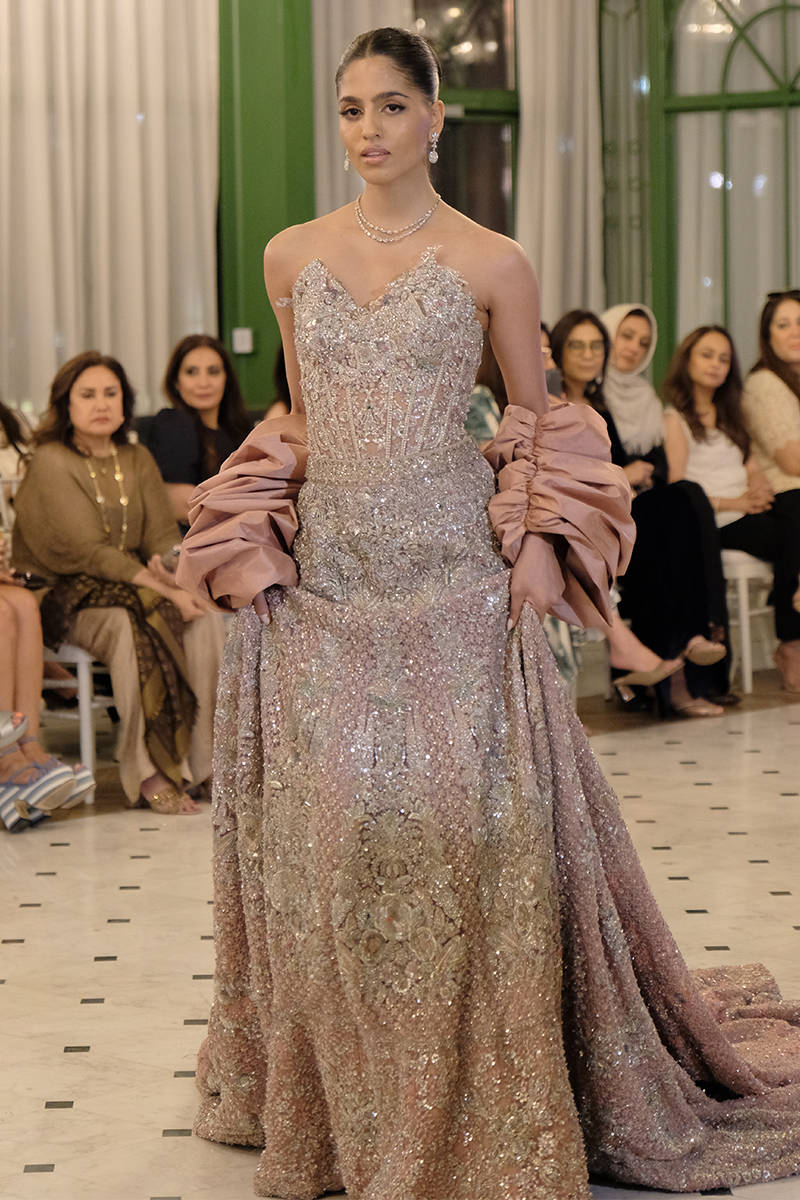 Exuding majestic allure, this exquisite pastel pink bridal gown features a heavily hand-embellished long trail. Adorned with embellishments, the gown exhibits a shimmering metallic effect. The design incorporates delicate Swarovski crystals, dabka, zari, and intricate beadwork, all contributing to the ensemble's refined elegance. The outfit is completed with fully embellished sleeves and a body-hugging trail skirt that enhances its overall beauty. The ensemble is further elevated by a stunning, heavily embellished veil, which adds an extravagant touch. This veil imparts a regal and contemporary aesthetic to the outfit, completing the bridal look with sophistication. It can also be paired with a Corset and taffeta for sleeves