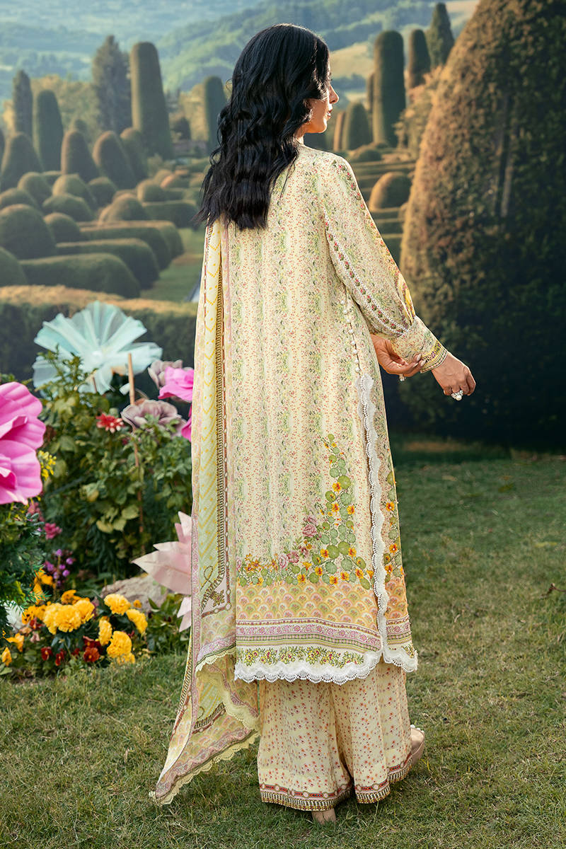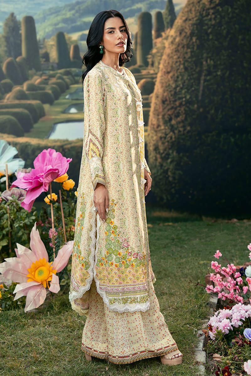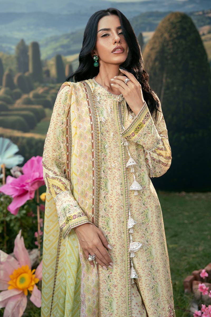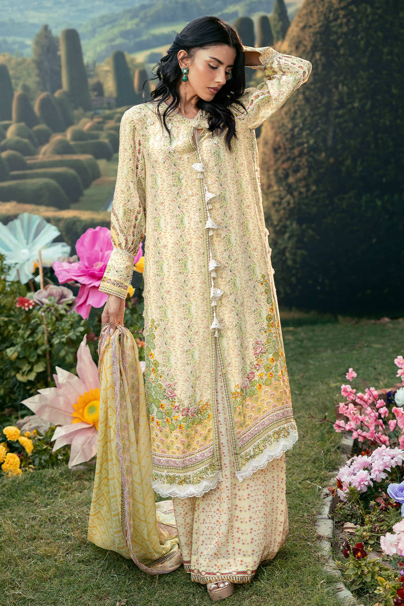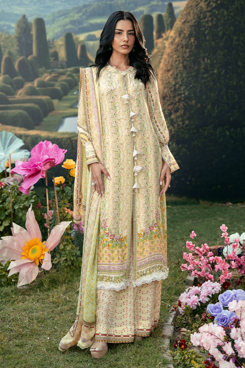 A refreshing lime ensemble featuring a printed front-open shirt adorned with playful tassels along the front, adding movement and charm. The hem is finished with delicate ruffled lace detailing, bringing a soft, feminine touch, while the elongated cuff sleeves lend a structured, contemporary edge. Paired with matching pants and a printed dupatta, this look beautifully balances vibrant energy with refined elegance.