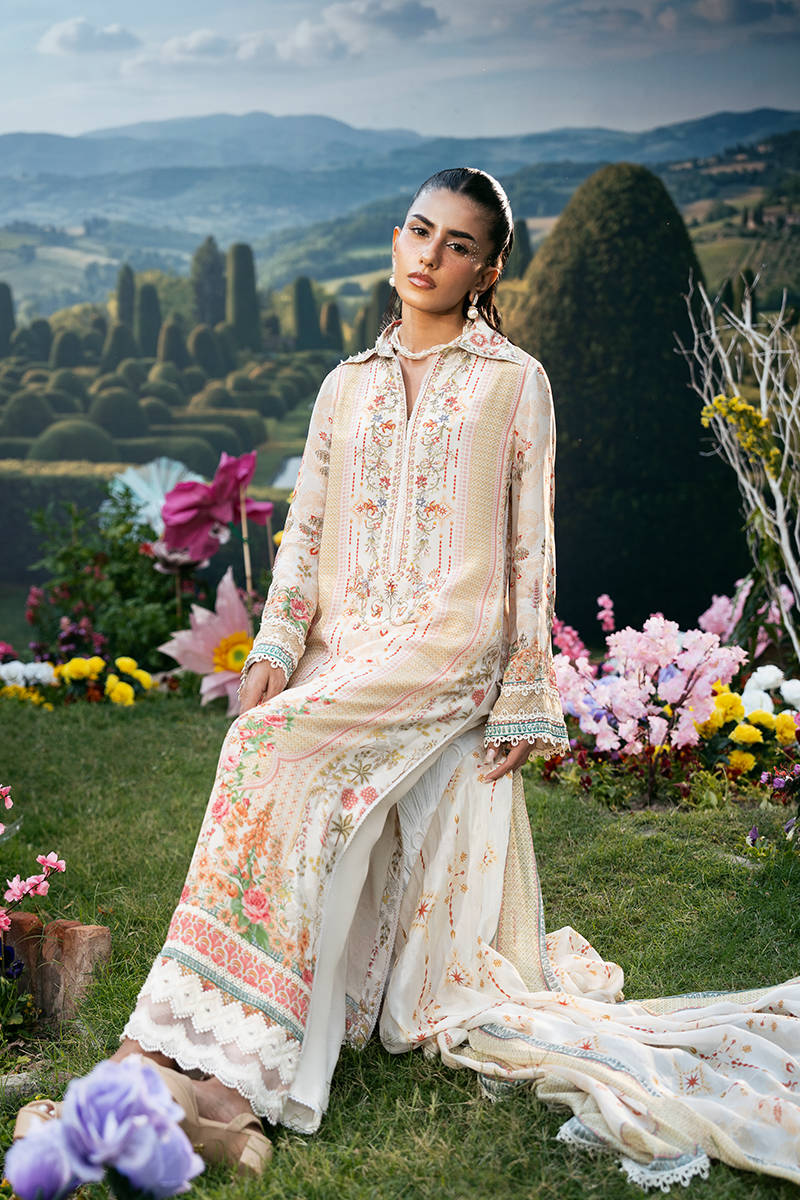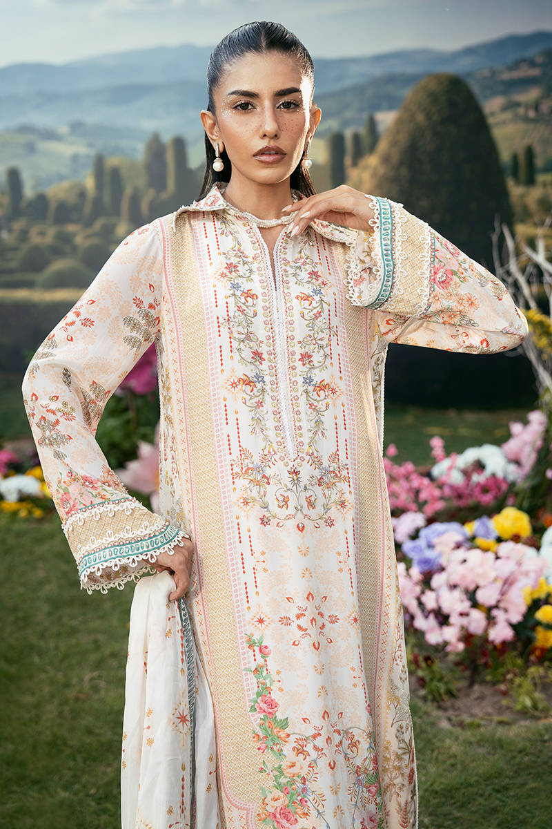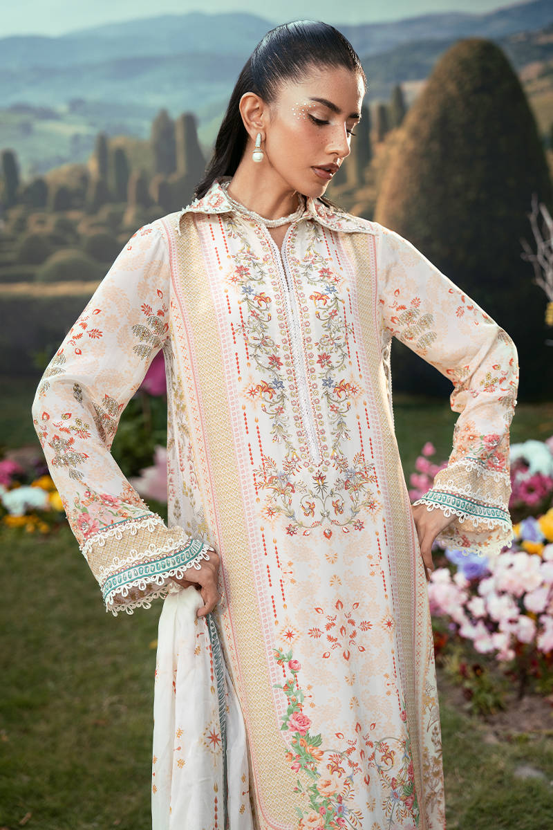 A long straight-fit shirt in a soft pastel tone, featuring a structured collared neckline and delicate floral embroidery along the front. It is paired with sleek straight pants for a clean, elongated silhouette, and Paired with a printed dupatta that adds a subtle touch of pattern and elegance to the overall look.