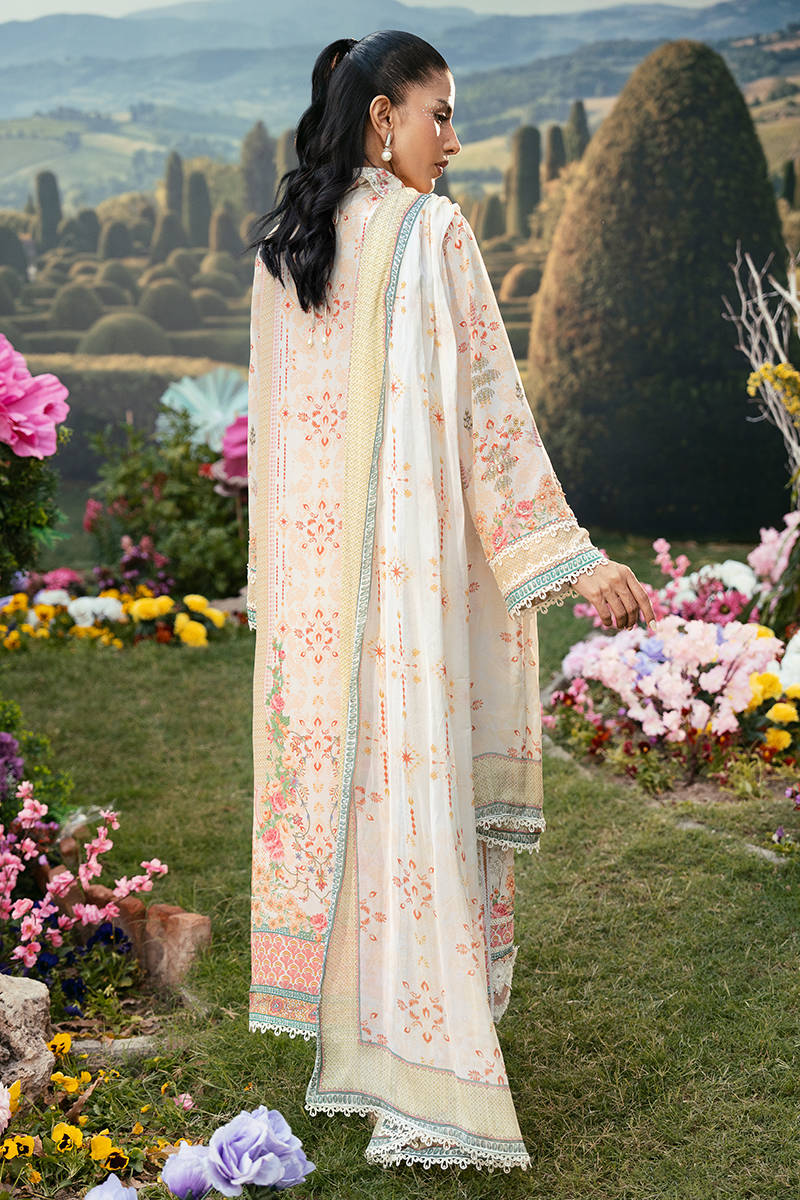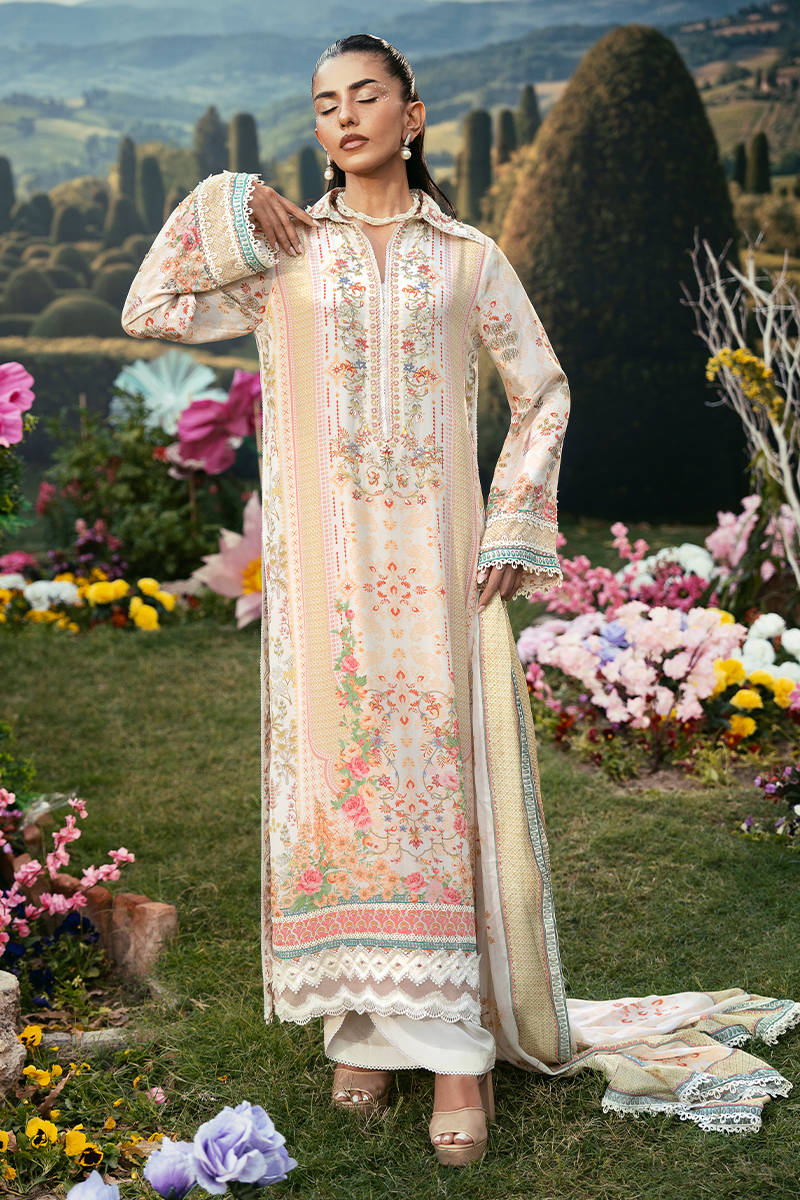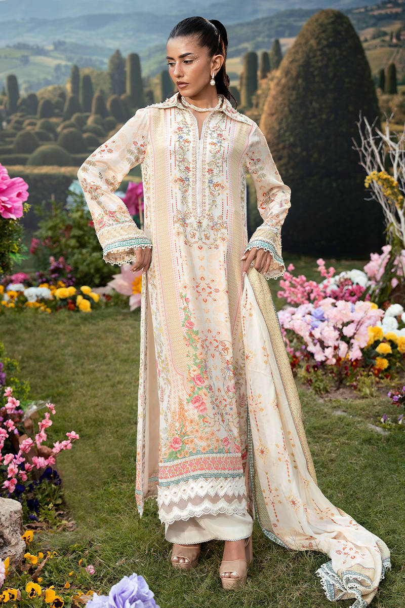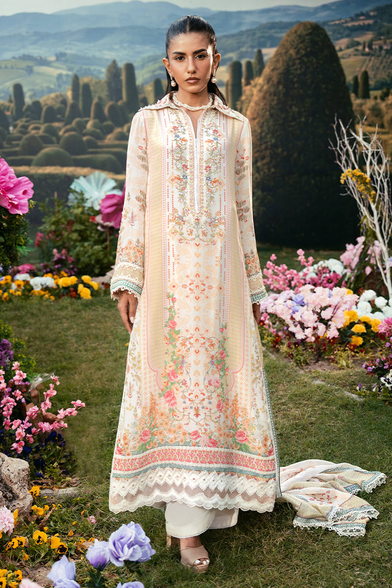 A long straight-fit shirt in a soft pastel tone, featuring a structured collared neckline and delicate floral embroidery along the front. It is paired with sleek straight pants for a clean, elongated silhouette, and Paired with a printed dupatta that adds a subtle touch of pattern and elegance to the overall look.