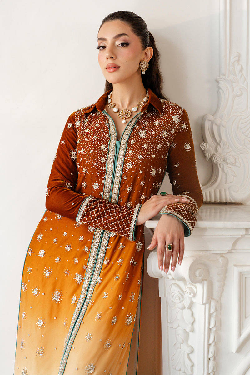 Color: Shirt: Ombre and Pants: Ivory Fabric: Shirt: Velvet and Pants: Raw Silk Work Details: Hand-Embellished