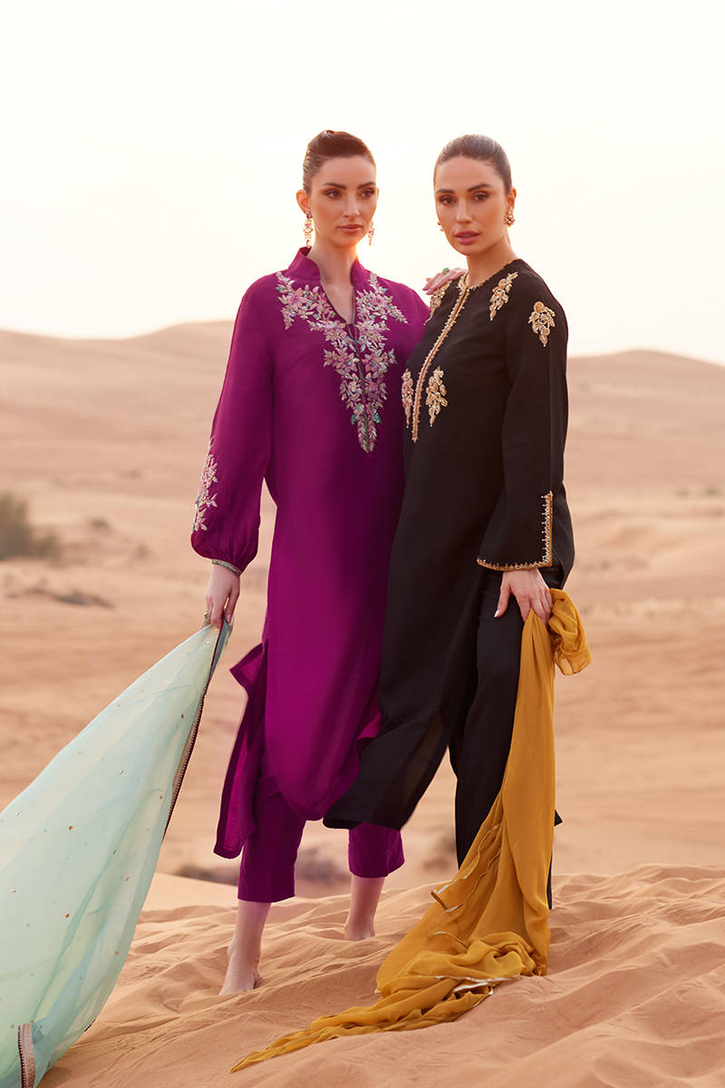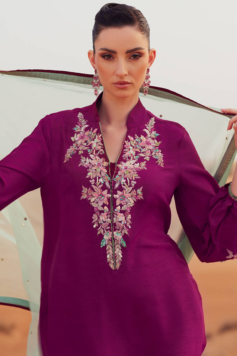 An A-line shirt in Korean silk, hand-embellished with delicate motifs along the neckline and sleeves. Paired with tailored Korean silk cigarette trousers for a sleek, contemporary silhouette. Completed with a medium organza dupatta for a light, airy finish