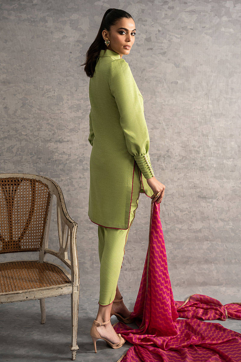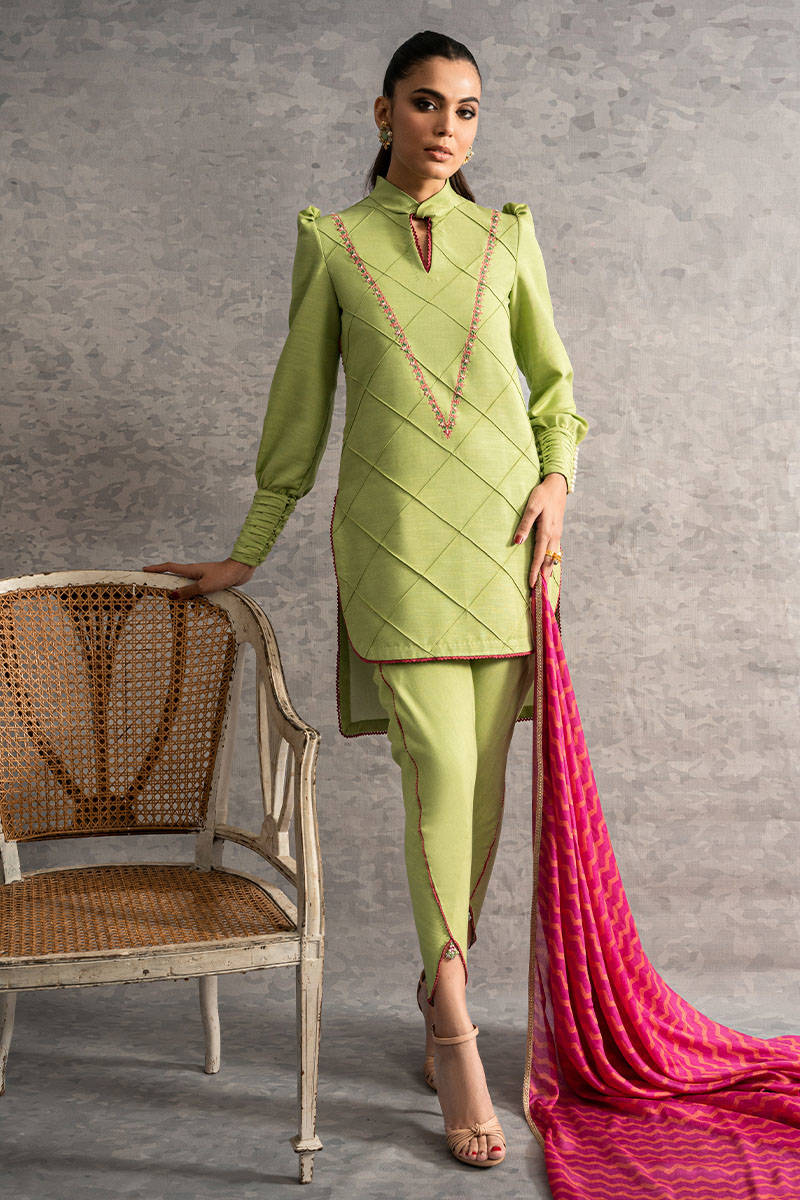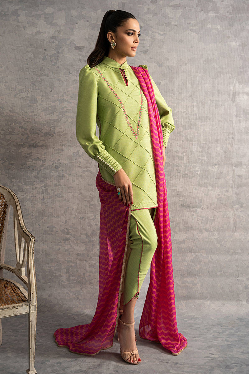A stunning pistachio colored karandi pleated shirt with embroidered neckline and puffed sleeves with pearl finishing’s, paired with the same colored tulip shalwar, completed with a printed silk dupatta.